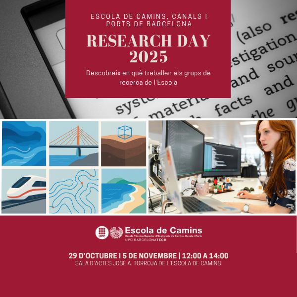 L'Escola de Camins celebrarà els propers 29 d'octubre i 5 de novembre de 2025 la seva Jornada de Recerca, un esdeveniment clau per presentar a la comunitat la innovació i el coneixement que es genera a l’Escola. La sala d'actes José Antonio Torroja serà l'escenari on 16 grups de recerca presentaran les seves principals línies de treball, projectes i oportunitats de col·laboració en un format àgil i directe.