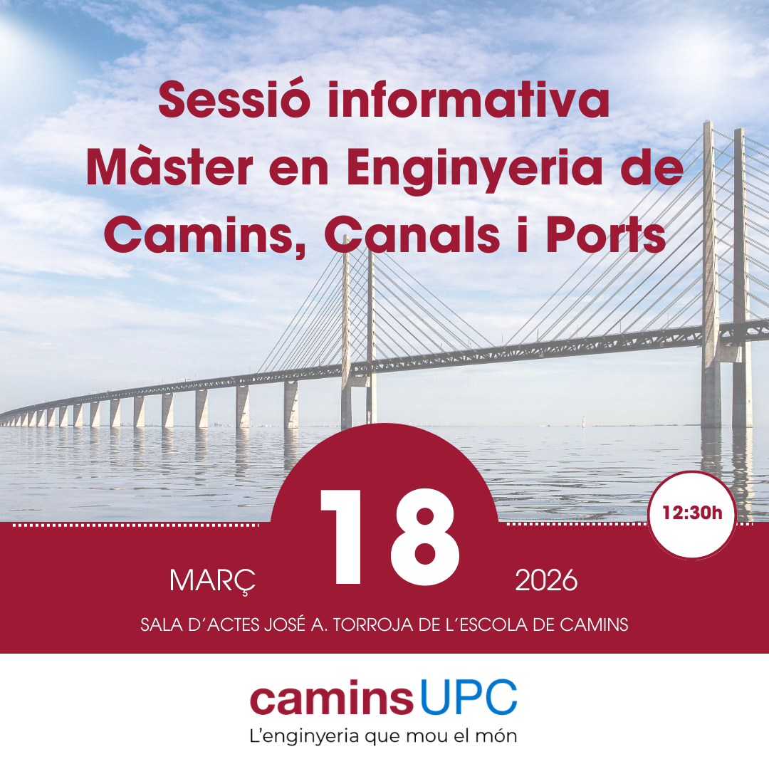 El dimecres 18 de març a les 12:30h a la sala d'actes José A. Torroja de l'Escola de Camins tindrà lloc la sessió informativa del màster en Enginyeria de Camins, Canals i Ports a càrrec del prof. Francesc Soriguera, sotsdirector d'estudis de Màster i cap d'estudis del Màster en Enginyeria de Camins, Canals i Ports.