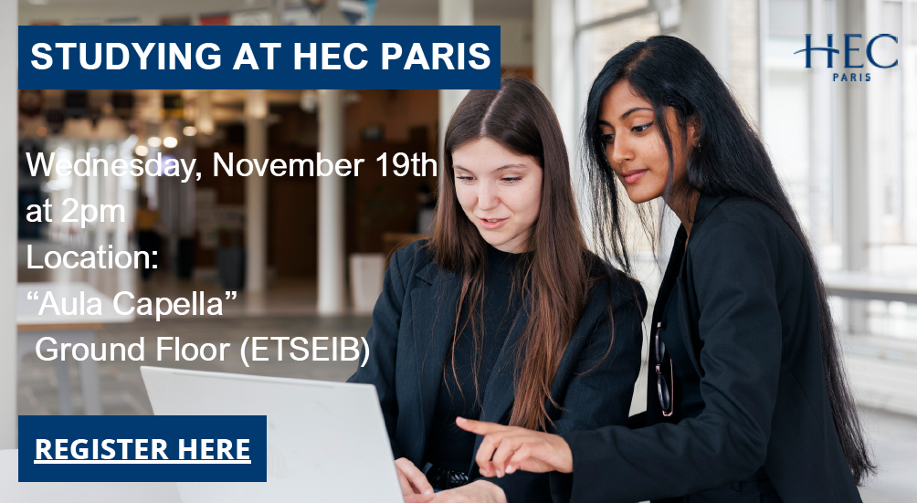El proper dimecres 19 de novembre a les 14h a l’Aula Capella, ETSEIB, Edifici PI, planta Baixa, tindrà lloc la presentació del programa d'Intercanvi amb l’École des Hautes Études Commerciales-HEC. Zoey Crabb, Recruitment Manager at HEC Paris presentarà el Màster in Management i el procés d’admissió al programa.